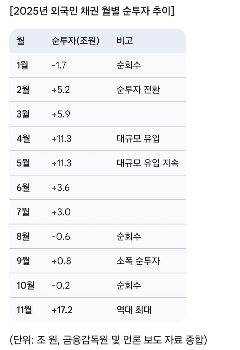 앞서 외국인은 지난 4~5월 11조 원대의 대규모 순투자를 하며 강한 매수세를 보이다 8월과 10월 만기 상환 등으로 인해 순매도를 보였다.