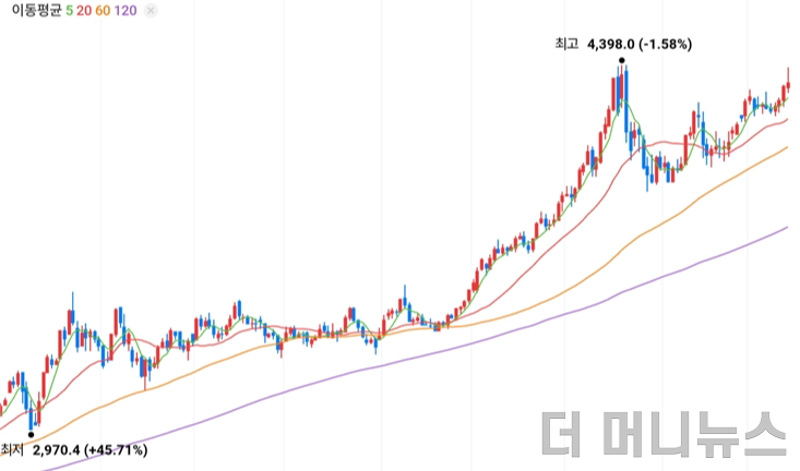 14일 네이버금융에 따르면 국제금 선물가격은 지난 10월20일 장중 4,398.0달러를 찍으며 사상 최고치를 경신했다. 그러나, 바로 상승분을 반납하고 밀려 같은달 28일 4,000달러선이 무너지는 조정을 보였다. 이후 한달여동안 저점을 높이던 금값은 지난 11일 4,300달러선을 넘어선뒤 이틀연속 오르는 상승세를 지켰다.